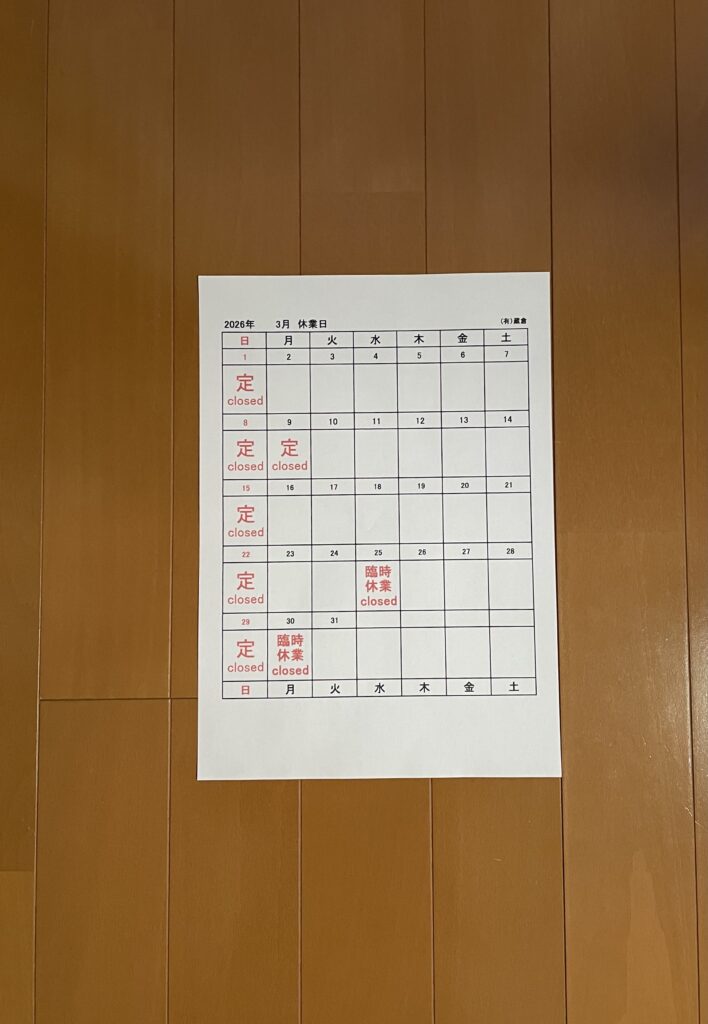3月の休業日は、日曜日と第二月曜日の定休日の他に、25日(水)30日(月)を臨時休業とさせていただきます。