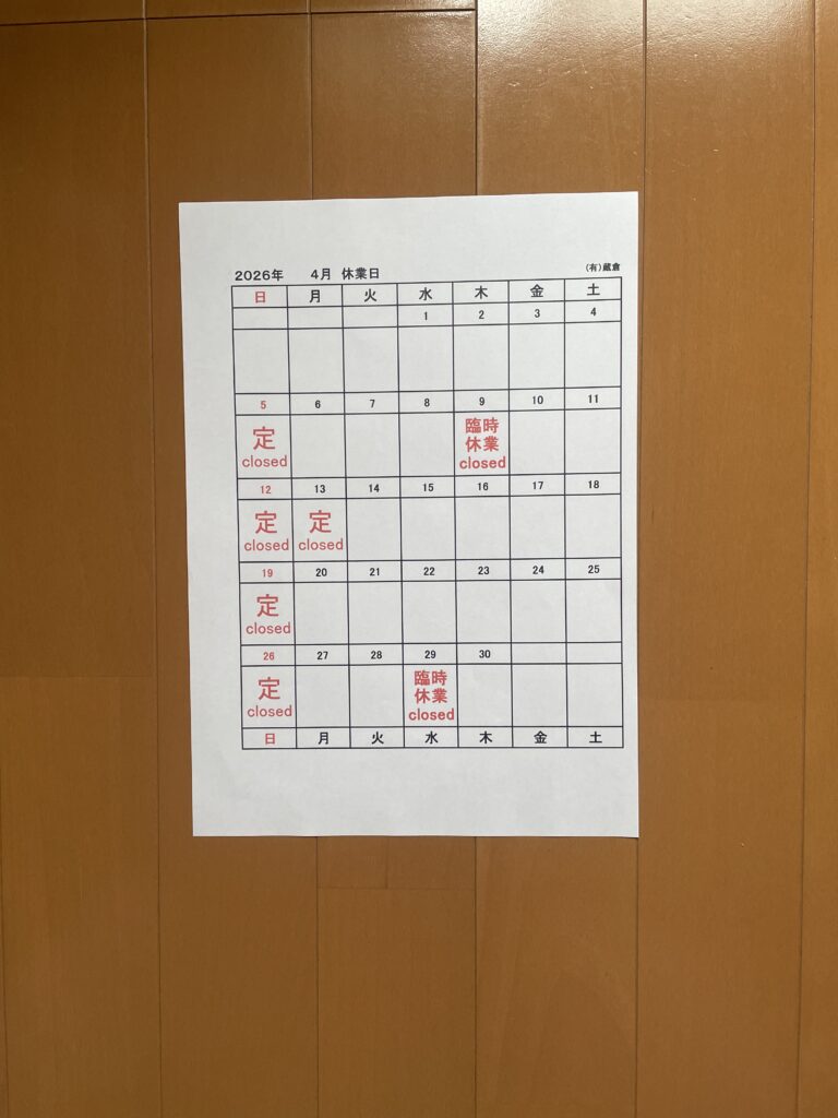 4月の休業日は、日曜日と第二月曜日の定休日の他に、9日(木)29日(水)を臨時休業とさせていただきます。